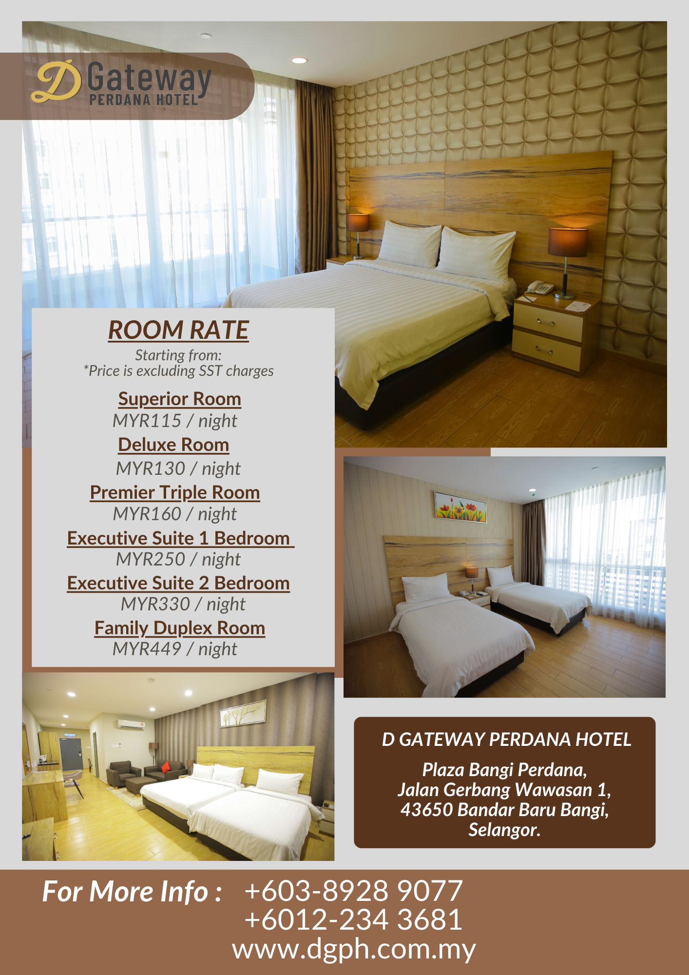 Experience D Gateway Perdana Hotel (Formerly Known as Sherwood Gateway Hotel) service at its finest, customer has always been our main priority whether for leisure or for business. Our spacious rooms are catered for your comfort and convenience.